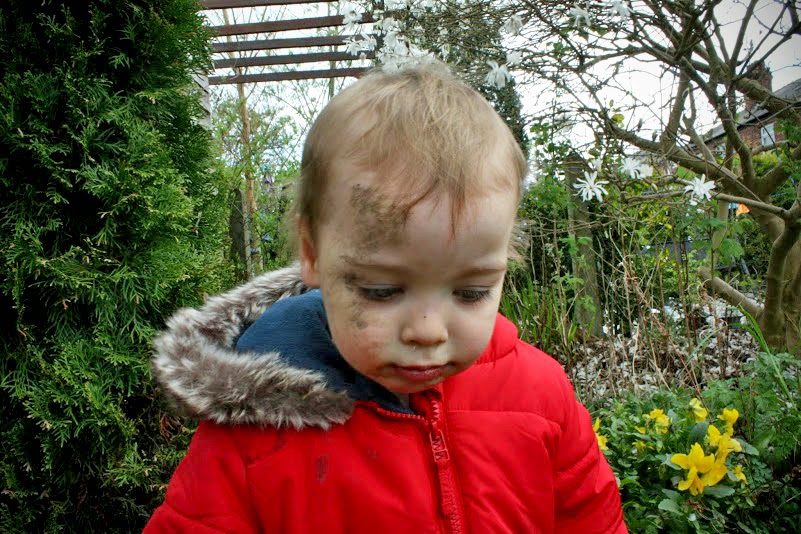 As she was running towards the mud, she lost her balance and flew forwards. She landed face down and skidded into the flower bed. I waited for a moment, unsure as to whether this was going to cause tears, only to watch her jump up and squeal, "Muuuud!" before laughing loudly and going in for a second skid.