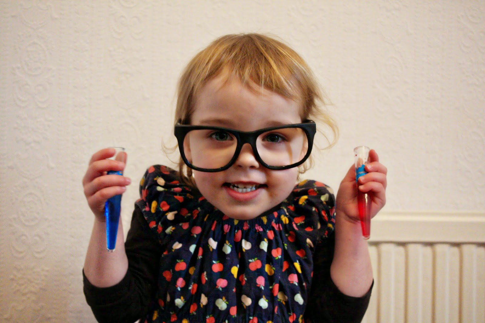 Payday has finally arrived, and so we celebrated with a lunch at the pub and a trip to the charity shop. I found an unopened mini science kit for 50p, complete with pipette, tweezers and magnifying glass. I've wanted a pipette for Ebony ever since we went to visit our local(ish) Montessori nursery and saw a little girl diligently playing with a pipette and water. And finally the day has arrived. We filled these two (not really, but sort of) test tubes up with water and food colouring, and then experimented with the pipette, mixing the colours together. The glasses are just for fun, obviously.