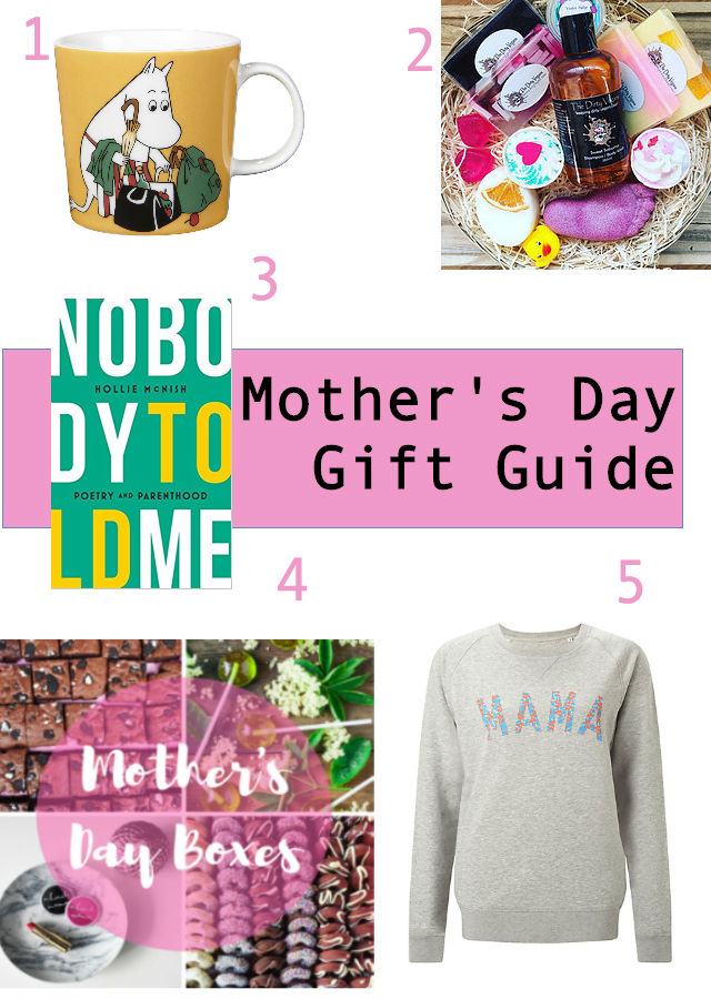 1. Moomin Mama Mug £17 from Amara (they have lots of other designs too, I need them all to hang from hooks above my breakfast bar, right?) // 2. Luxury Large Vegan Gift Basket £31.99 from The Dirty Vegans (how amazing does this look! I can't imagine a more relaxing gift.) // 3. Nobody Told Me: Poetry and Parenthood by Hollie McNish £6.29 from Amazon (I need this book. I love Hollie McNish a lot.) // 4. Mother's Day Box £20 from A Kind Mama (how amazing do these donuts look? I need them in my life. Also, the brownies.) // 5. Selfish Mother Sweatshirt £50 from John Lewis (it wouldn't be a Mother's Day gift guide without one of these, would it?)