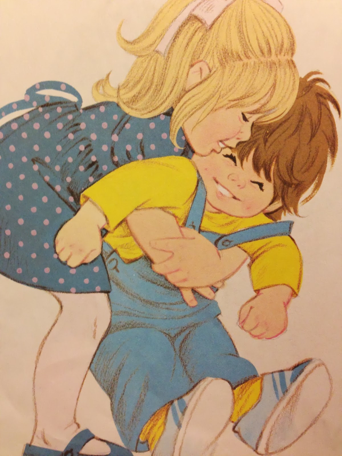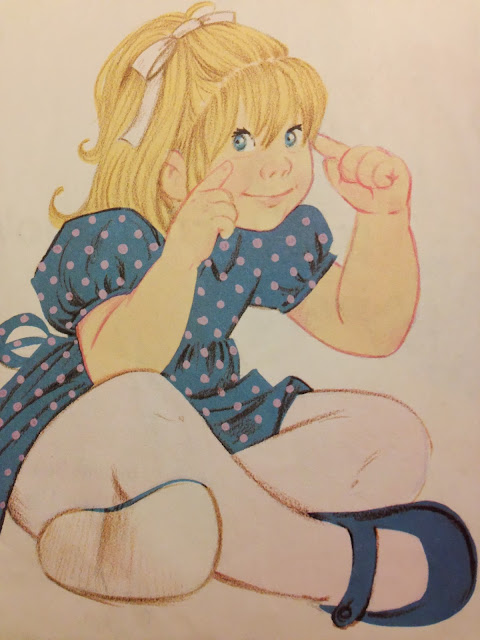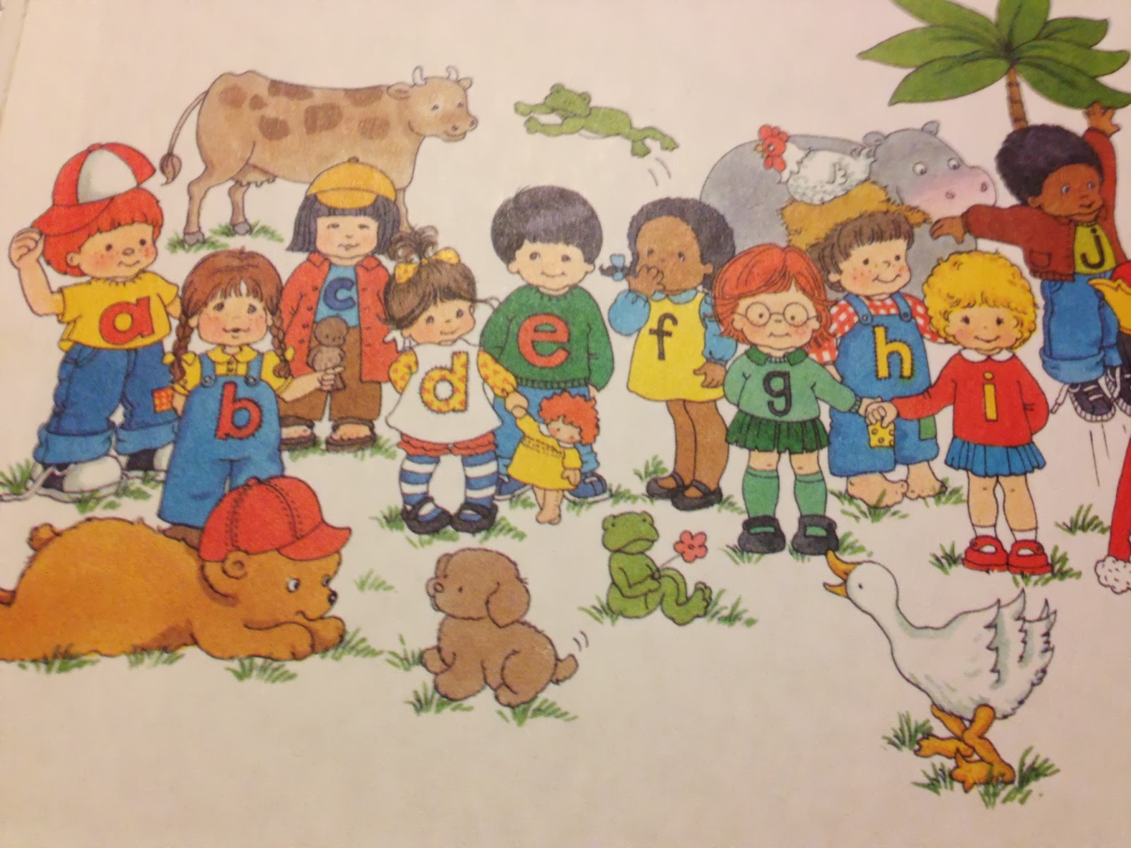 I found this book in a local charity shop last week. It's a book to help children learn to read, so is a bit advanced for Ebony, but she loves looking at the pictures all the same. We have a bookshelf filled with books in the living room, and this one keeps getting dragged out and handed to me. "Knee. Knee." she says, until I sit her on my knee and start reading.