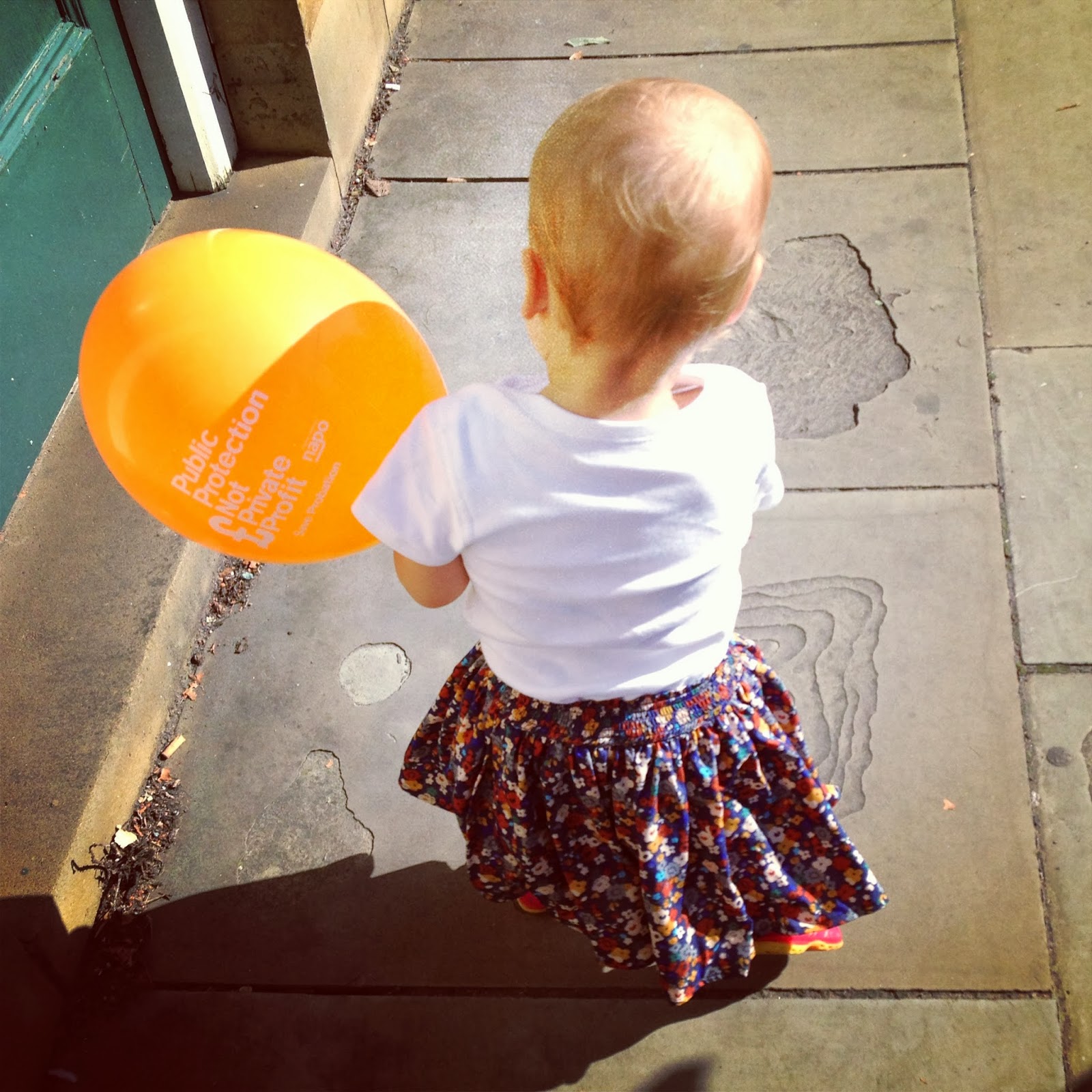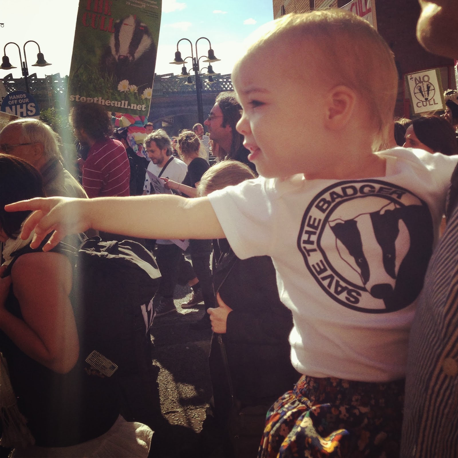 Protest marches aren’t particularly baby friendly - there’s cigarette smoke, shouting, hideous megaphones and no toilets - which is probably why we haven’t taken Ebony on a march until now. Protest marches are very toddler friendly - there’s shouting, noisy megaphones and people dressed as badgers - Ebony had a great time. There were dogs to stroke, music to dance to, and balloons to hold. She marched with gusto, in that weird forward leaning way that toddlers do when really they want to be flung in the air. She collected stickers, balloons and noise makers. She waved endlessly at a friendly human-sized badger,and loved all the people milling around.