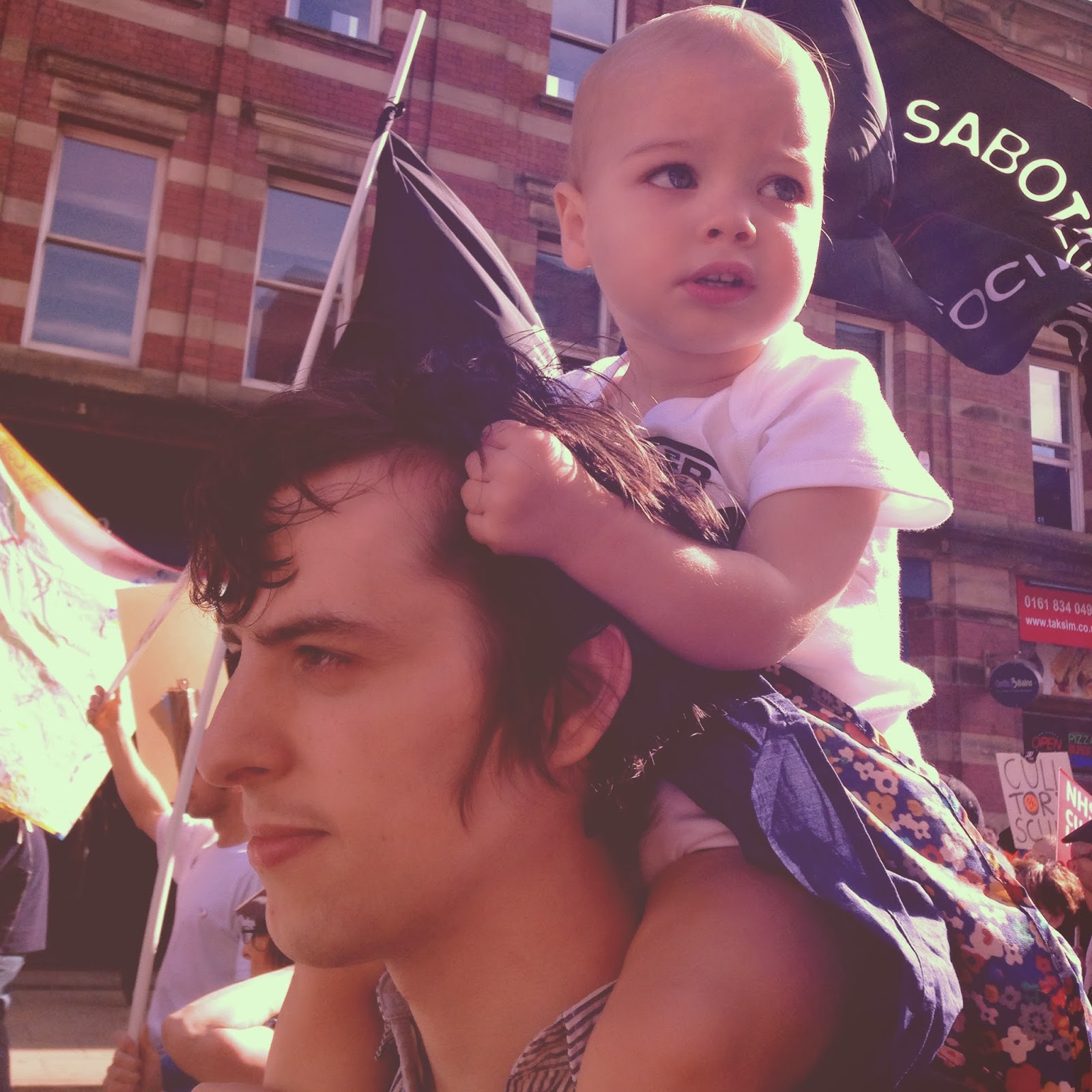 We took Ebony on her first protest march today. Well, her first protest march outside my womb anyway. The Conservative Party *spits on floor* are holding their annual conference in Manchester this weekend, and so there was a huge protest march planned. The main Save the NHS march was organised by the TUC, but there were loads of other groups taking part in the march for various causes.