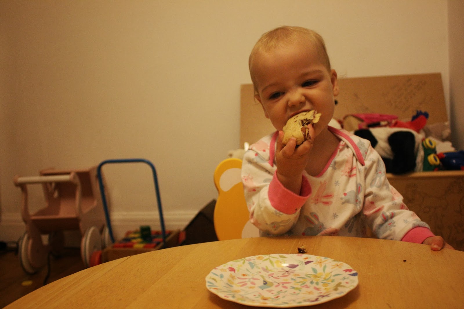 Ebony rolled out the pastry herself. Several times. And dropped some of it on the floor. And ate some. Then we put the filling ingredients onto the rolled out pastry, and folded it in to create a sealed pocket. I used a skewer to mark holes in the top to allow the steam to escape during cooking, and then placed it on the baking tray in the oven for 30 minutes.
