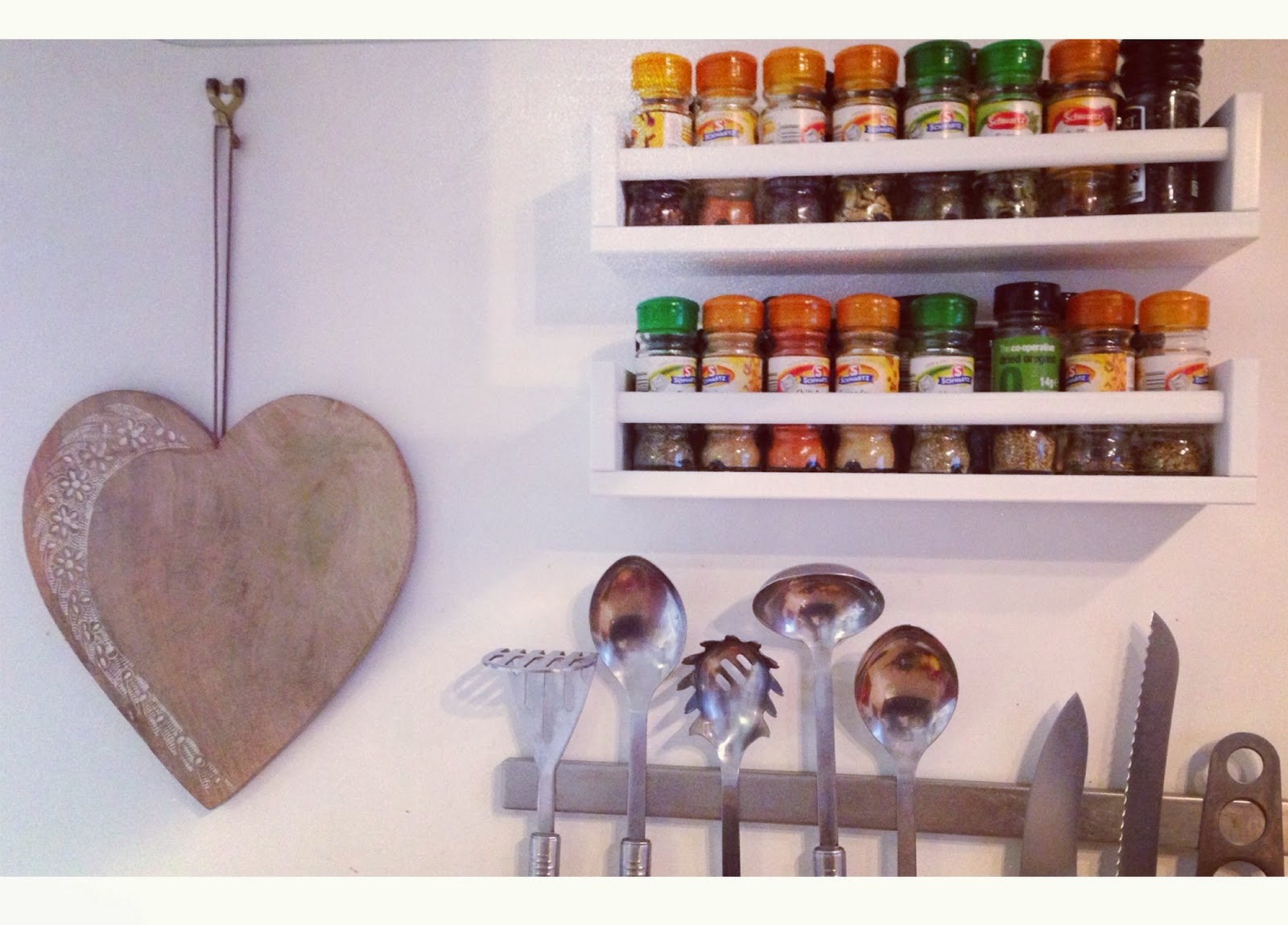 After reading the article about how three quarters of men still take on most of the DIY, I decided it was high time I set a good example for Ebony. I decided to put up some spice racks because our kitchen is tiny and cupboard space is at a premium. I bought some plain racks from Ikea, and put them together as soon as we get home. Then we went out to Homebase to buy some primer and paint, because I wanted the spice racks to be white. It took a couple of coats to get the right finish, and during this time I probably taught Ebony that spray painting indoors is a terrible idea, spray painting without putting protective coverings down is a bad idea, and spray painting in your new jeans can only end in tears. After these invaluable lessons had been learnt, it was time to put the shelves up.