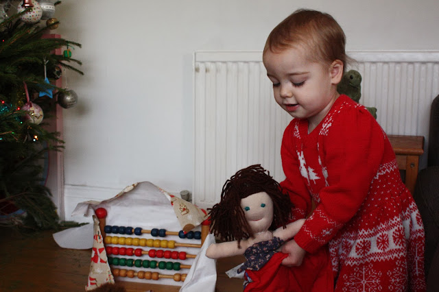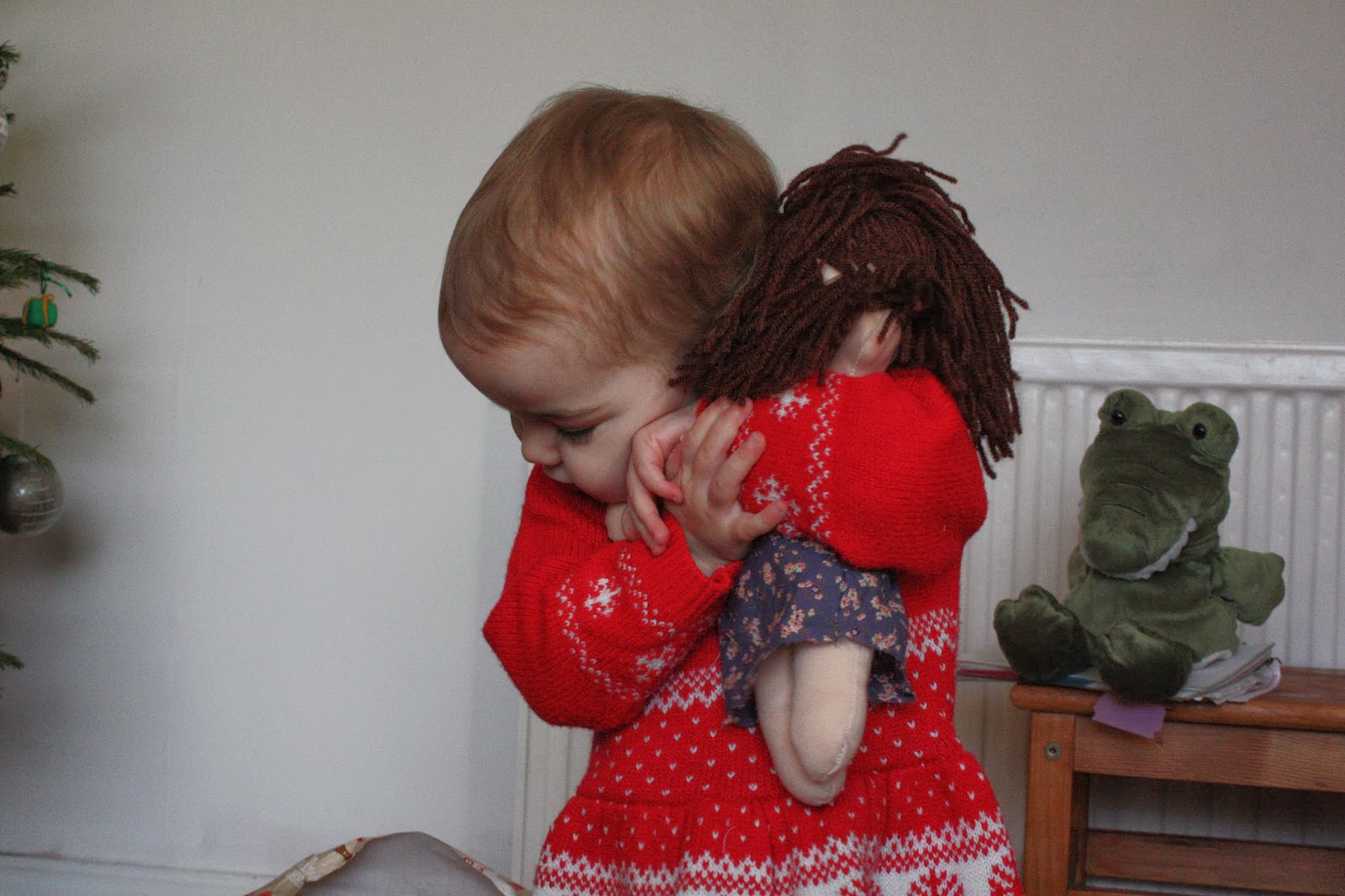 Her main present from us was a homemade doll. It took a whole day to make, and is far from perfect, but I hope she will always be treasured. She has an excessively saggy neck akin to that of Deirdre Rachid, she has quite serious alopecia in some places, and it’s possible her belly button is a little high. I’m not convinced she will stand up to washing, hair pulling or rough housing, but so far she remains intact. Ebony pulled the doll from her stocking while exclaiming, “Dolly!” and then gave her a massive hug, so hopefully they will be friends for life.