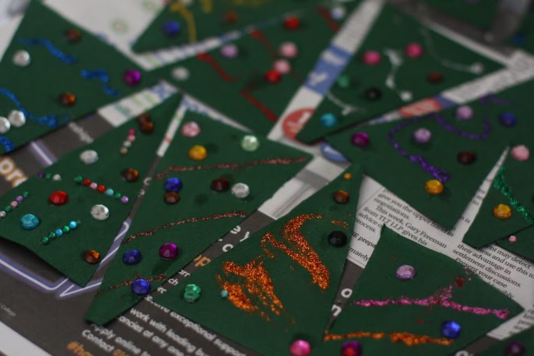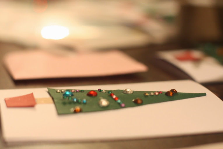 I already had some blank cards and envelopes, so just needed to get the extras. I ordered the red and green card online, and managed to find some gems too which I thought would be great as baubles. The (very weird) card shop down the road sold glitter glue, and then we had everything we needed.