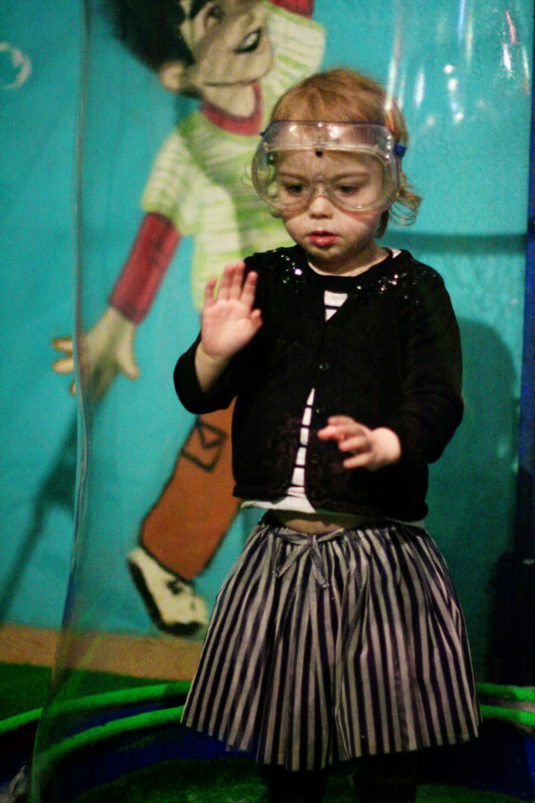 There was an area where you could dig for fossils, and then materials out so you could do colourings of them. One of Ebony’s favourite bits was a huge bubble you could stand in. You stood in the middle of a circle, and then pulled on a rope which lifted the circle up, creating a cylindrical bubble around you. She very much enjoyed popping it.
