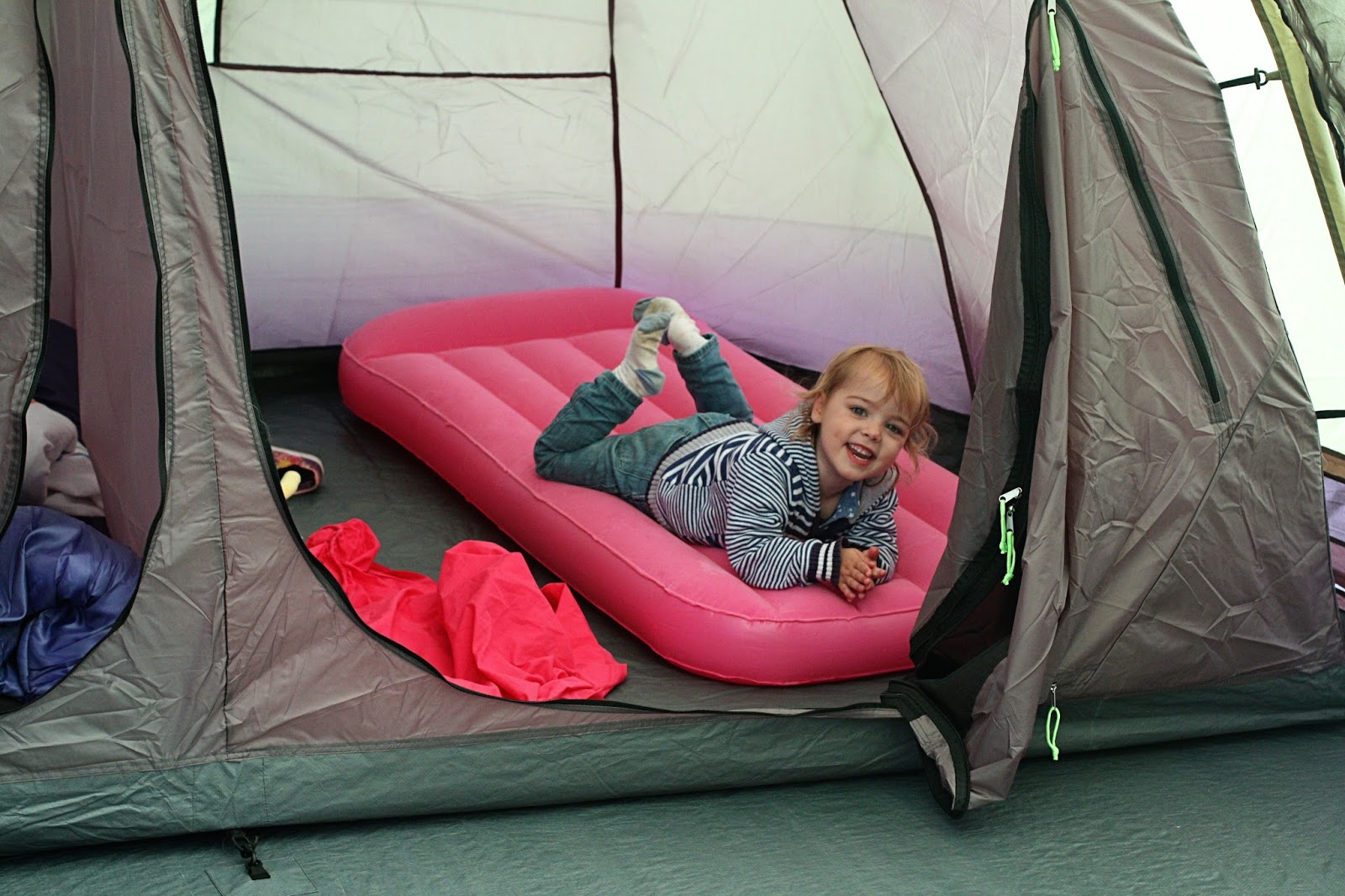 We got the Buckingham Elite 8 Man Tent which is ridiculously huge, though I can't say I regretted the decision once. I'm more used to camping in two man tents, so the amount of space we had was a real luxury. It was really easy to put up, even with Ebony's 'help'. There are two to four bedroom compartments depending on how you choose to set up the tent. We just put one of the bedroom compartments up but then used the optional room separator so that Ebony had her own bedroom. She was more than a little bit thrilled with the prospect of having her own airbed. The tent is big enough to stand up in so seems even bigger than it really is. When it rained, we had plenty of space for playing or eating inside.