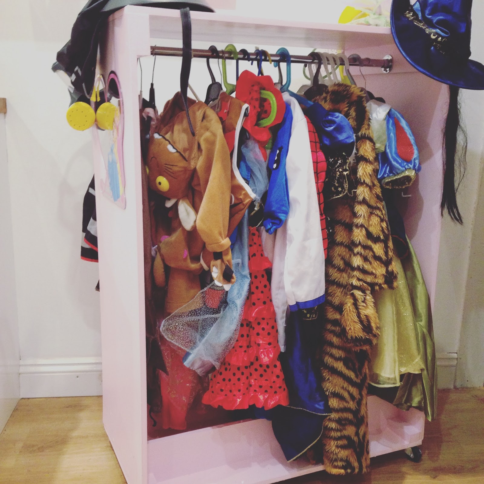 Anyway, so it was just my parents joining us for Christmas. They arrived at 2pm and then there were more presents to unwrap. My childhood was filled with amazing homemade toys thanks to my very talented mum and dad (this talent was not passed down genetically to the next generation), and for Christmas this year, my dad had made Ebony a place to keep her dressing up clothes (of which she has many). It was a place for her hats, plenty of room for her costume, hooks for her accessories and a place for the shoes. And it even has a mirror so she can see how she looks. In short, it’s amazing. And it has finally solved my problem of where the hell should all these costumes go!?