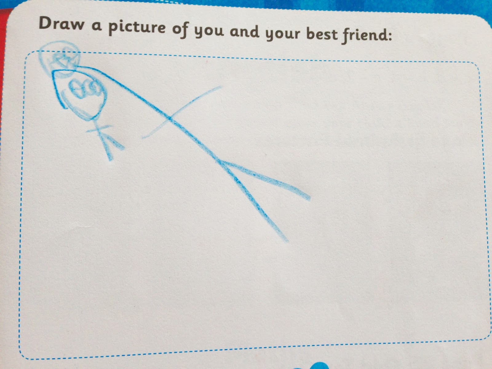 Whilst I was hunched over the floor trying to get the tar off (but mostly accidentally chipping the floorboards), Ebony was doing a workbook. In it, she was asked to draw a picture of her and her best friend. She almost drew her friend from nursery but then changed her mind and drew a picture of herself cuddling the new baby. I shed some tears, of course (and not because the baby appears to have three eyes).