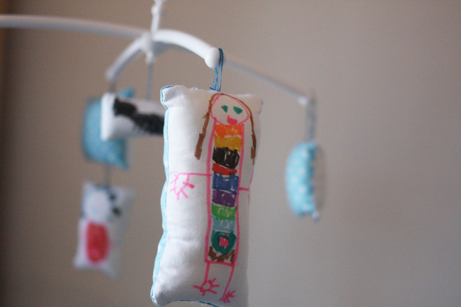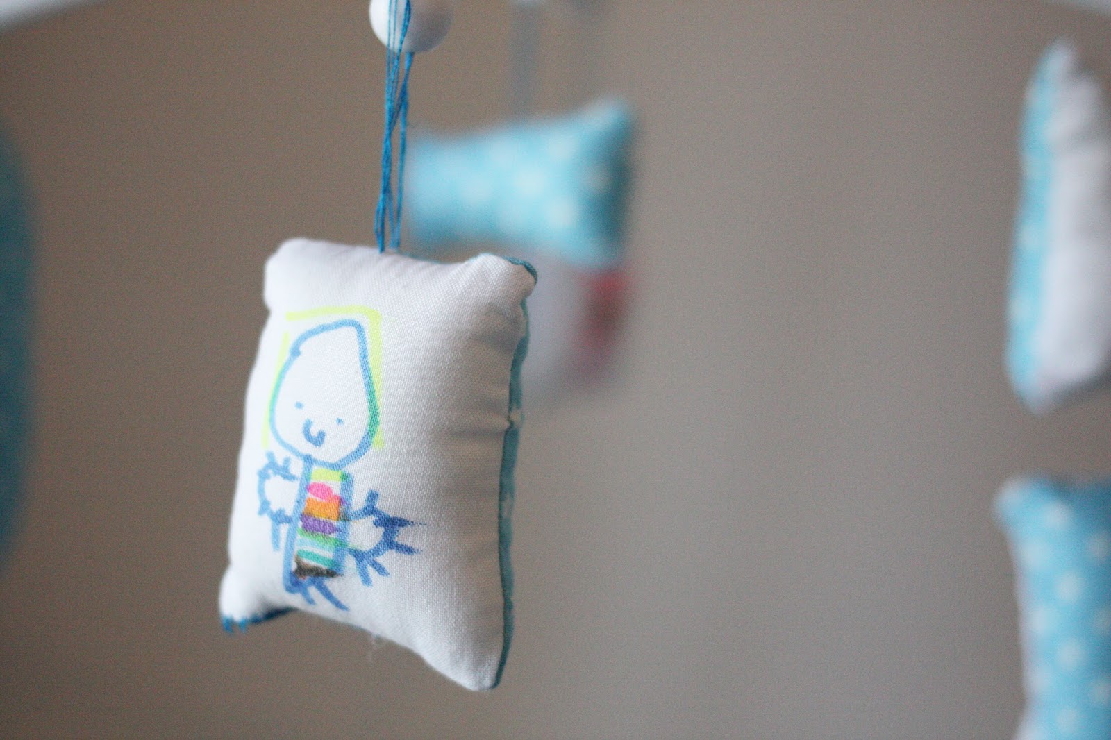 Once all of the drawings had been stuffed and sewn and the mobile hanger had arrived, it was time to fix the mobile together. I simply used thread to fix the stuffed drawings in place, though I’m not sure how well this will hold out once the baby manages to grab them.