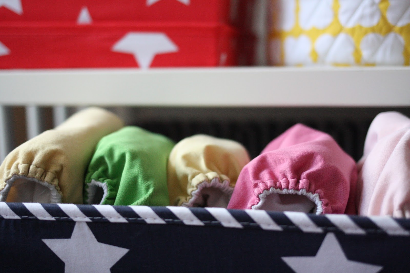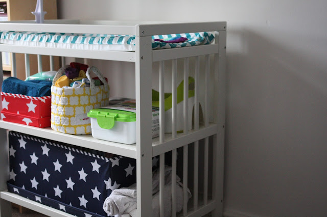 I wanted some brightly coloured storage for under the changing table and fell in love with the designs from Minene. I chose this huge fabric navy box for £30 from John Lewis. It fills almost a whole shelf and is big enough to house all the washable nappies. I currently have 21 nappies, a load of extra liners, nappy bags and spare wipes in there and there’s still room for more. I also bought the smaller box in red for £11.50 from Amazon. I love the vibrant red and the huge stars, it looks lovely. I’m currently using it to store a pack of disposable nappies, some disposable wipes and a beautiful blue towel I bought for when the baby’s born.