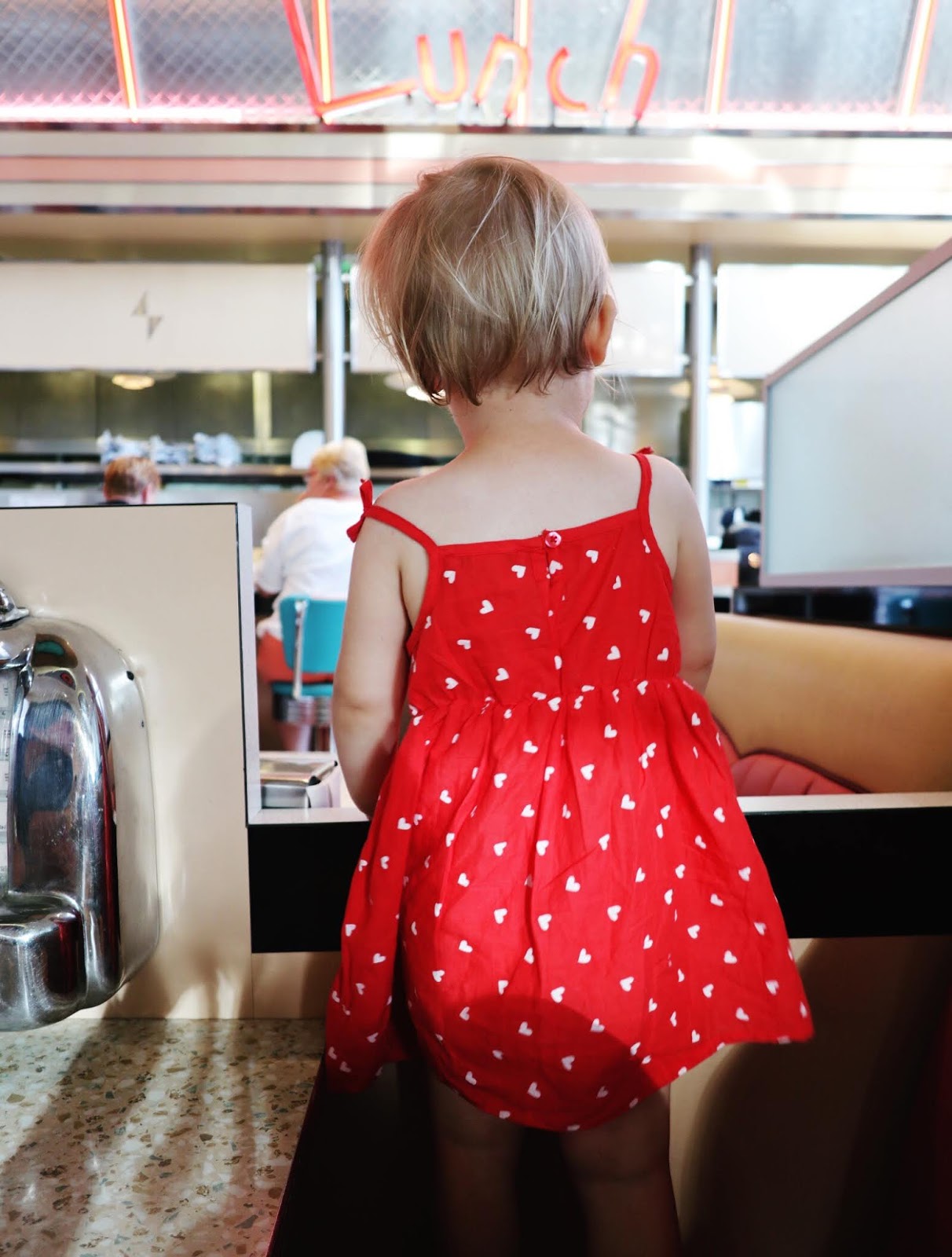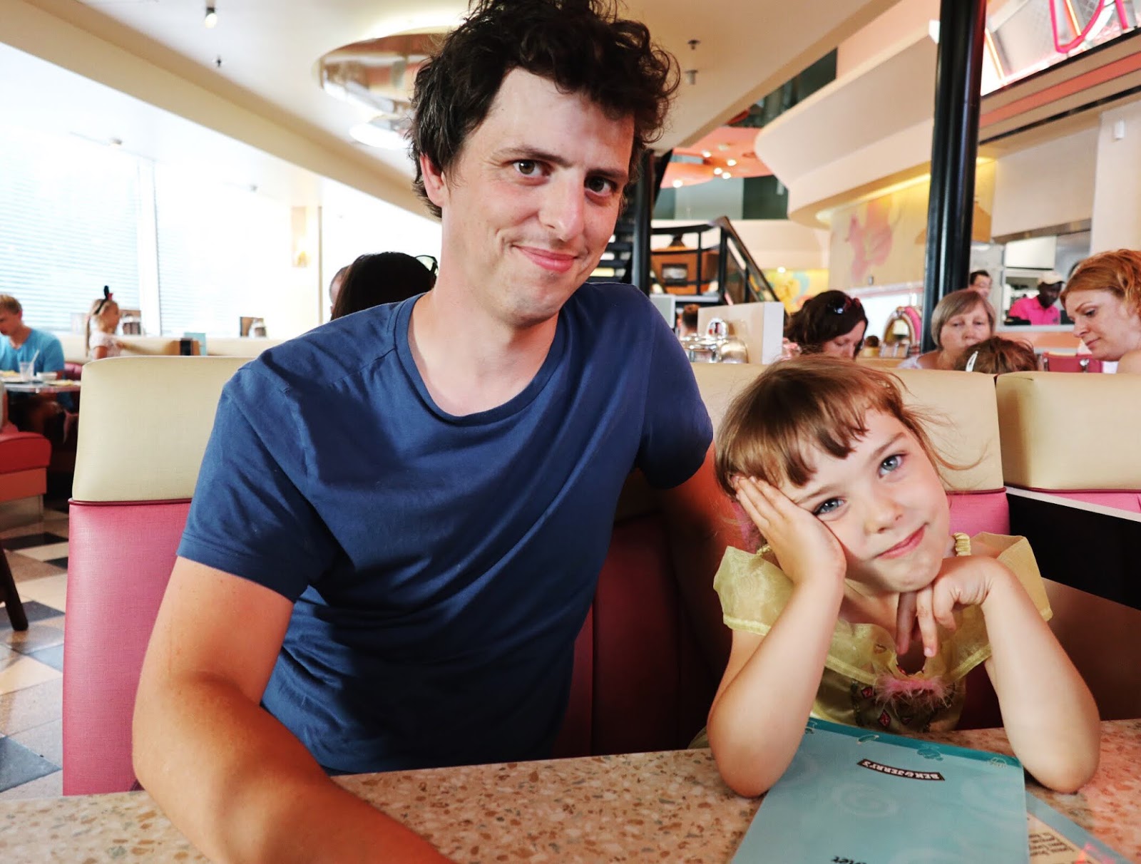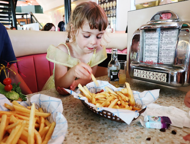 The day we went for dinner, however, there were no rollerskates to be found. The restaurant was crazy busy so it’s not surprising there wasn’t much room for roller skates, but I was a little disappointed because I think Ebony would have loved seeing the skaters. We ate at the restaurant on Thursday night when we were killing time before the fireworks. It was probably 8ish by the time we sat down at the table. There was a big queue at the door. You can’t book a seat in advance so you have to wait in line until a table becomes available. After around a 20-minute wait, we were seated at a booth.